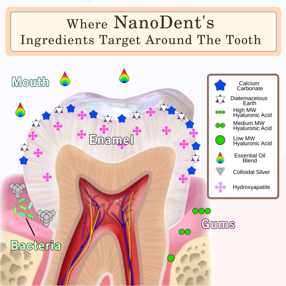Discover the power of nature in every brush with all-natural NanoDent toothpaste. Thoughtfully crafted with Nano-colloidal Silver for a fresh, clean mouth; Nano-hydroxyapatite to strengthen enamel; Xylitol & Essential Oils for a crisp, clean mouth feel; Diatomaceous Earth and Calcium Carbonate for gentle whitening & polishing; and Hyaluronic Acid to leave gums feeling soft and hydrated. Rooted in time-honored ingredients and inspired by science, it delivers a refreshing, effective clean—naturally!